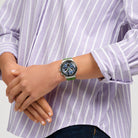 Αυτός ο χρονογράφος από ανοξείδωτο ατσάλι διαθέτει μπλε sun-brushed καντράν με μαύρα υποκαντράν, λευκούς τυπωμένους αριθμούς, ενδείξεις της ώρας που λάμπουν στο σκοτάδι και λευκή ένδειξη ημερομηνίας με μαύρη εκτύπωση στη θέση της ώρας 3. Την ώρα δείχνουν ο ασημί ωροδείκτης και λεπτοδείκτης σε σχήμα βέλους που λάμπουν στο σκοτάδι και ο πράσινος δείκτης δευτερολέπτων του χρονογράφου. Διαθέτει κάσα και στεφάνη από βουρτσισμένο ανοξείδωτο ατσάλι με μαύρη επίστρωση PVD και λευκή τυπωμένη ταχυμετρική κλίμακα. Το ρολόι ολοκληρώνουν το ανάγλυφο, πράσινο ματ λουράκι με τα ταιριαστά θηλάκια και το μισό κούμπωμα από βουρτσισμένο ανοξείδωτο ατσάλι.