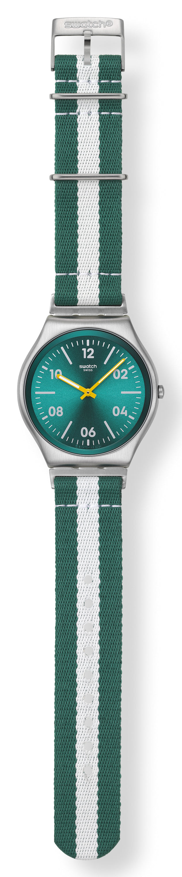 Αυτό το εξαιρετικά λεπτό ρολόι διαθέτει πράσινο καντράν με sun-brushed φινίρισμα, πράσινη φλάντζα, λευκές τυπωμένες ενδείξεις, αριθμούς και ζώνη ενδείξεων λεπτών, καθώς και κίτρινο ωροδείκτη και λεπτοδείκτη που λάμπουν στο σκοτάδι. Η αμμοβολισμένη κάσα από ανοξείδωτο ατσάλι, τα θηλάκια και το μισό κούμπωμα συμπληρώνονται από το ριγέ υφασμάτινο λουράκι σε πράσινο και λευκό χρώμα.