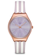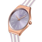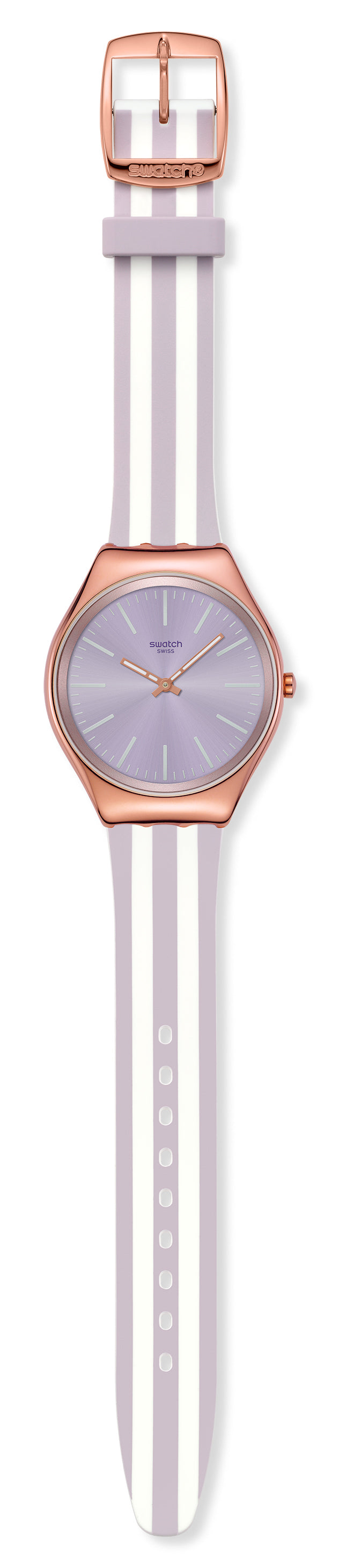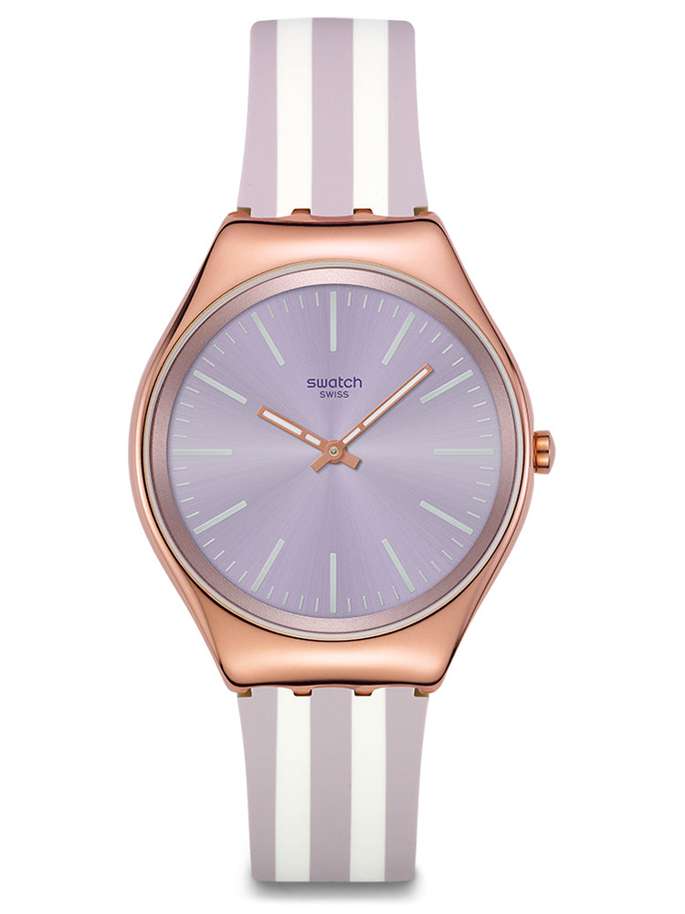 Αυτό το εξαιρετικά λεπτό ρολόι διαθέτει καντράν σε ανοιχτό μωβ με sun-brushed φινίρισμα, στεφάνη σε ανοιχτό μωβ, λευκές τυπωμένες ενδείξεις και ζώνη ενδείξεων λεπτών, καθώς και τριανταφυλλί-χρυσαφί ωροδείκτη και λεπτοδείκτη που λάμπουν στο σκοτάδι. Η γυαλιστερή κάσα από ανοξείδωτο ατσάλι με τριανταφυλλί-χρυσαφί PVD και ταιριαστό κούμπωμα συμπληρώνονται από το ριγέ λουράκι σε ανοιχτό μωβ ματ και λευκό χρώμα με θηλάκι σε ανοιχτό μωβ ματ χρώμα.