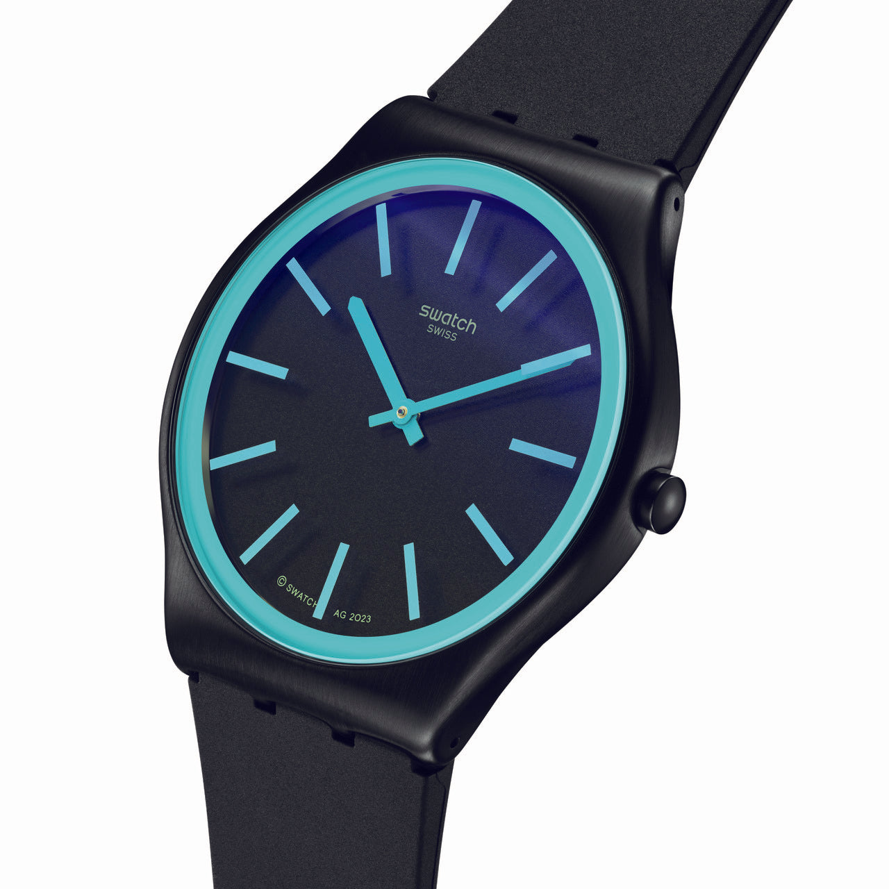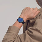 Το μαύρο καντράν και ο μπλε ωροδείκτης και λεπτοδείκτης αυτού του εξαιρετικά λεπτού ρολογιού από ανοξείδωτο ατσάλι λάμπουν κάτω από το τζάμι με εφέ Solar Spectrum με τις μπλε εκτυπωμένες ενδείξεις. Η κάσα και το κούμπωμα από βουρτσισμένο ανοξείδωτο ατσάλι διαθέτουν μαύρη επίστρωση PVD και συμπληρώνονται από το μαύρο λουράκι με το ταιριαστό θηλάκι.