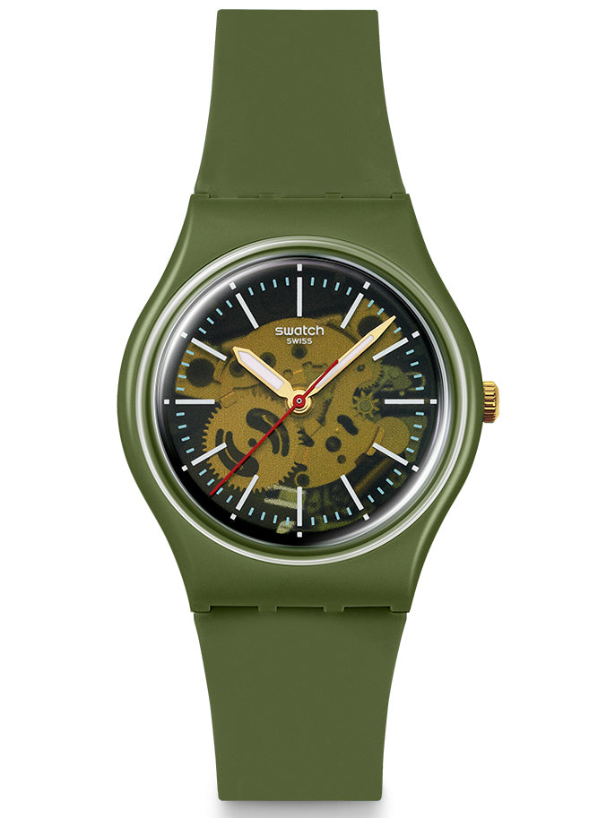 Αυτό το ρολόι διαθέτει ένα διαφανές χακί πράσινο καντράν που επιτρέπει τη θέαση του μηχανισμού κίνησης και διαθέτει λευκή και γαλάζια διαδρομή λεπτών, χρυσούς δείκτες ωρών και λεπτών που λάμπουν στο σκοτάδι και κόκκινο δείκτη δευτερολέπτων, όλα προστατευμένα από τζάμι βιολογικής προέλευσης. Η ασορτί ματ χακί πράσινη κάσα, το λουράκι, το θυλάκι και η αγκράφα ολοκληρώνουν την εμφάνιση.