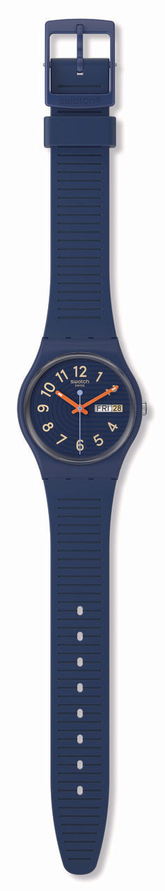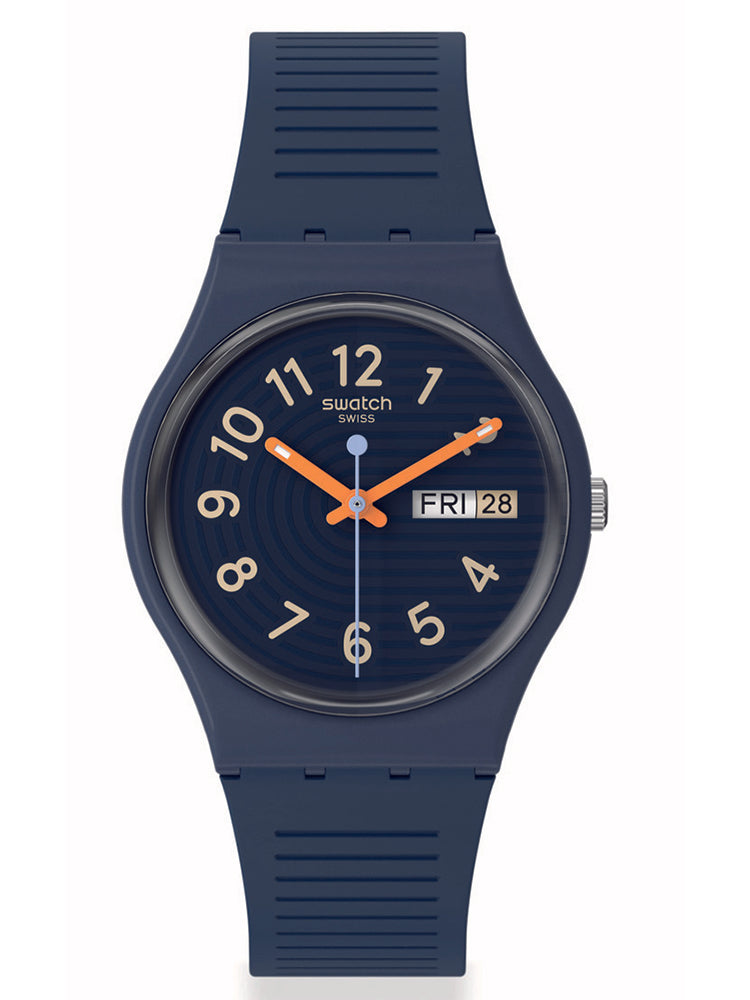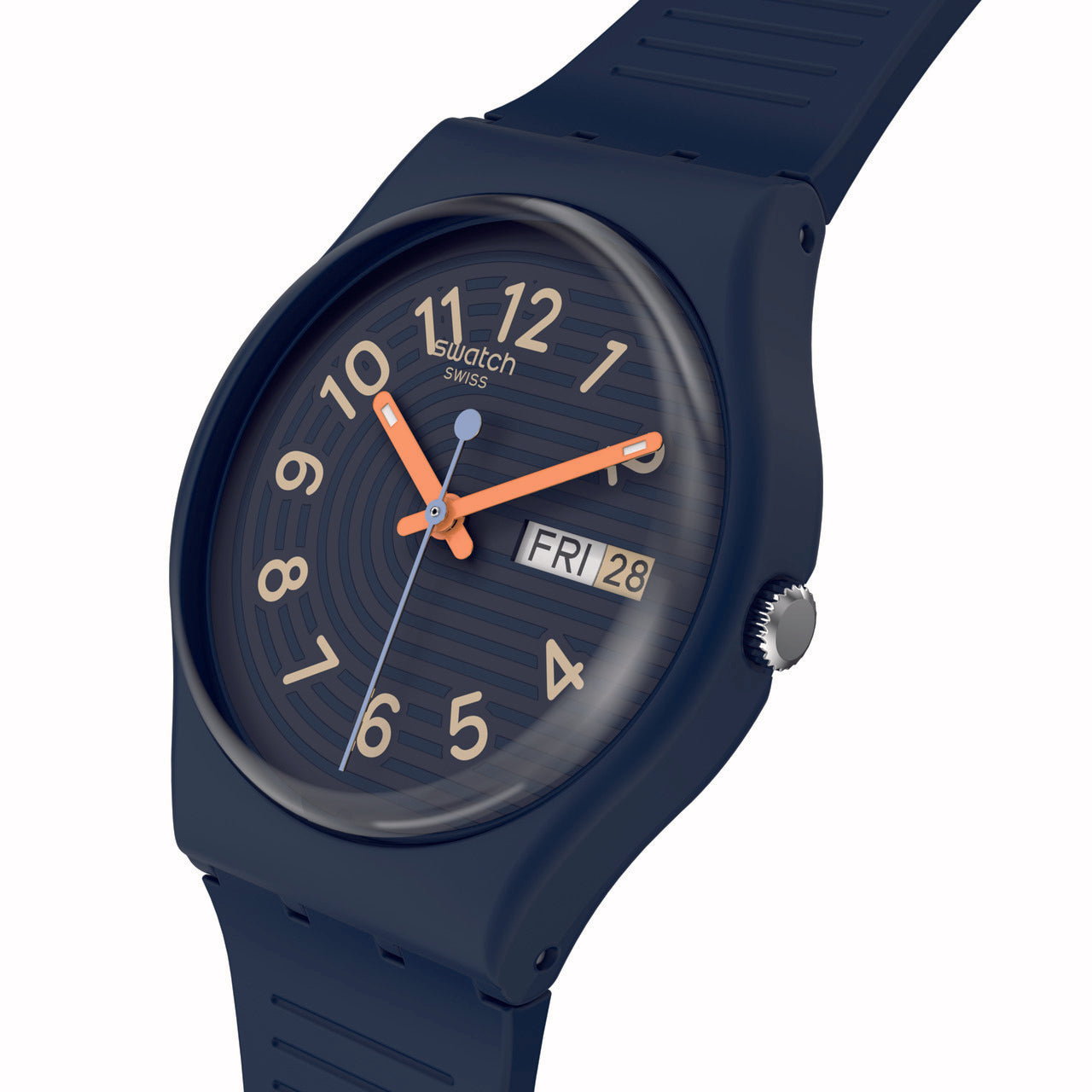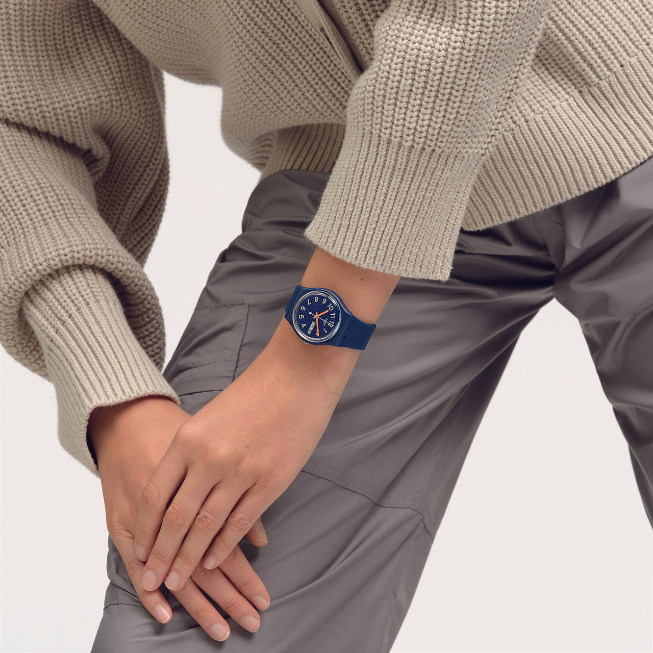 Το καντράν σε αυτό το σκούρο μπλε ρολόι διαθέτει εκτυπωμένους μπεζ αριθμούς και πιο σκούρα μπλε ανάγλυφη υφή σε κάσα βιολογικής προέλευσης με τζάμι βιολογικής προέλευσης. Οι δείκτες που λάμπουν στο σκοτάδι δείχνουν την ώρα, ενώ υπάρχει και ένδειξη ημέρας/ημερομηνίας στο σημείο της ώρας 3. Το ταιριαστό σκούρο μπλε λουράκι, το θηλάκι και το κούμπωμα δημιουργούν εντύπωση χάρη στην ενότητα του χρωματικού τόνου.