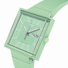 Η τετράγωνη κάσα του ρολογιού από BIOCERAMIC στο χρώμα της μέντας διαθέτει τζάμι βιολογικής προέλευσης από άκρο σε άκρο που επιτρέπει να φαίνονται οι εκτυπωμένες λευκές ενδείξεις του ρολογιού από το πλάι. Το τετράγωνο καντράν διαθέτει ασημί δείκτες που λάμπουν στο σκοτάδι και ένδειξη ημέρας/ημερομηνίας στο σημείο της ώρας 3. Το καντράν συμπληρώνει το ενσωματωμένο λουράκι βιολογικής προέλευσης με κούμπωμα BIOCERAMIC. Στο κάλυμμα της θήκης μπαταρίας στην πίσω πλευρά απεικονίζεται σε εκτύπωση η μπροστινή όψη του ρολογιού.